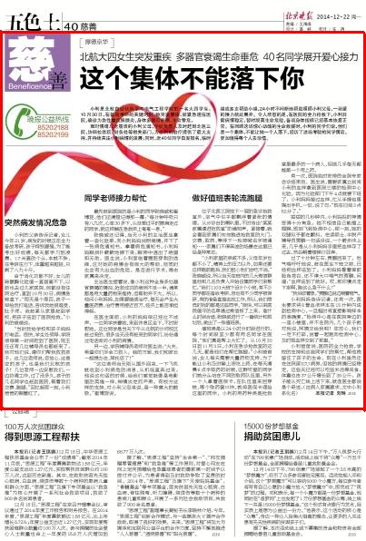 编者按:近日,我校自动化科学与电气工程学院一名大四学生在备战考研的关键时期突发重病,身体多器官衰竭,生命垂危,学校和学院领导高度关注,近40位同学临时组成多支帮助小组,24小时不间断地帮助照顾,一场爱的接力就此展开。《北京晚报》记者刘琳采写通讯报道此事,文章刊发于2014年12月22日的《北京晚报》。北航新闻网现全文转载。以飨读者。