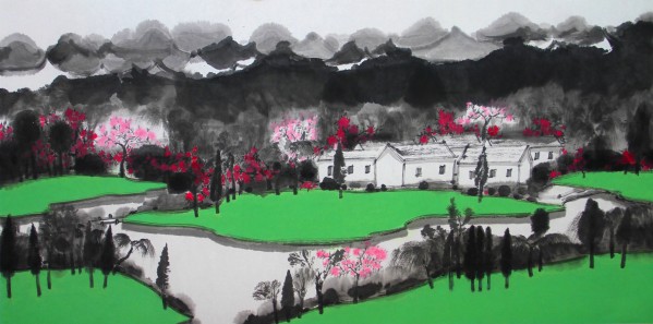 马良书的山水画追求的是“天人合一”的意趣。从他的作品中,能深深体悟虚静空灵的意境,天地山川、自然万物,自在自得,至美无言,于“大静”处观内心,从而悟解万物生命之本,这正是其作品的艺术魅力所在。他的作品常常富于诗意,既像诗的田园画,也像画的田园诗;同时他没有使用以往人们熟悉的画面形式,也没有使用常见的笔墨技巧,而以“新”为特点,新的民居元素、新的画面结构、新的墨色关系、新的用笔语言,又以“清”为特点,画面设色清新、气韵清新,从容平淡、不躁不急,透露出逸气洒脱的现代审美意韵。