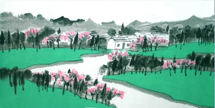 马良书的山水画追求的是“天人合一”的意趣。从他的作品中,能深深体悟虚静空灵的意境,天地山川、自然万物,自在自得,至美无言,于“大静”处观内心,从而悟解万物生命之本,这正是其作品的艺术魅力所在。他的作品常常富于诗意,既像诗的田园画,也像画的田园诗;同时他没有使用以往人们熟悉的画面形式,也没有使用常见的笔墨技巧,而以“新”为特点,新的民居元素、新的画面结构、新的墨色关系、新的用笔语言,又以“清”为特点,画面设色清新、气韵清新,从容平淡、不躁不急,透露出逸气洒脱的现代审美意韵。