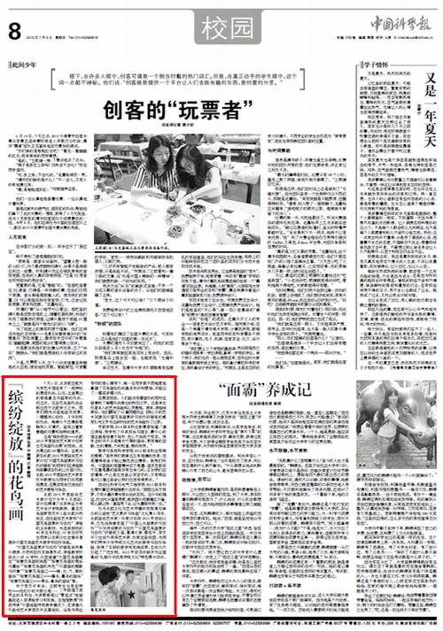 《中国科学报》2015年7月9日第8版“校园”报道我校2015年度驻校艺术家计划学生花鸟画作品展。