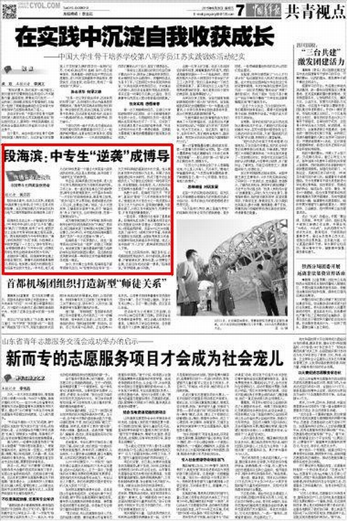 编者按:《中国青年报》2015年8月28日第7版共青视点版“传播青春正能量”专栏刊发我校段海滨教授的先进事迹——《段海滨:中专生“逆袭”成博导》,北航新闻网现全文转发,以飨读者。