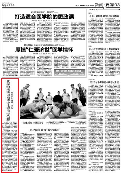 《中国教育报》要闻版2020年6月26日报道北航给未能返校毕业生寄出学位服: