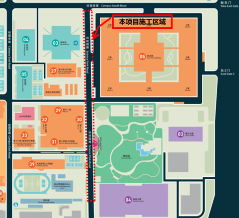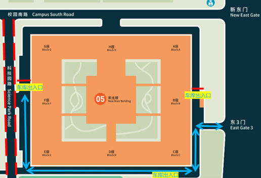 施工期间,新主楼内环、IRC充电停车区等科技园路出入口均将封闭,停放在新主楼地下车库(东库、西库)的车辆可经由东3门进出校园。同时,为方便广大教职工停车,自7月21日起东3门改为24小时开放。具体交通路线导流方式如图2及图3所示。