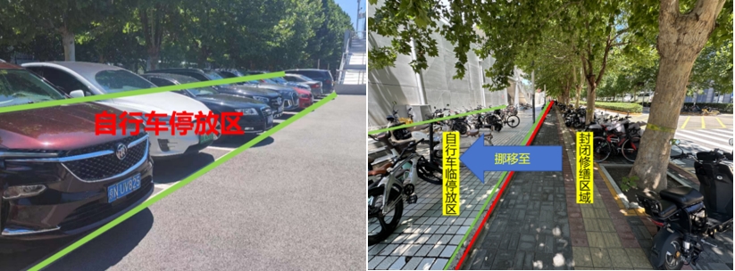 请各位师生于7月20日(周六)晚20点前将科技园路沿线道路两侧停放的个人车辆挪至其他区域停放。如无法及时到场挪移的,我们将统一挪移至指定临时停车区域,如图4所示。其中,无人机研究院十字路口以北车辆将向西挪移停放至体育馆东侧人行步道、体育馆西侧临时停放区;无人机研究院十字路口以南车辆将挪移至无人机研究院北侧(月宫一号南侧)道路沿线两侧步道停放。