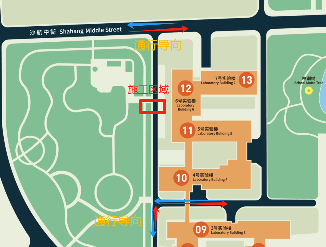 10月21日8:00-22日18:00对6号实验楼西侧柏油路及人行步道进行断路,行人及车辆可按图示通行导向通行(断路范围如下图红色区域所示)。