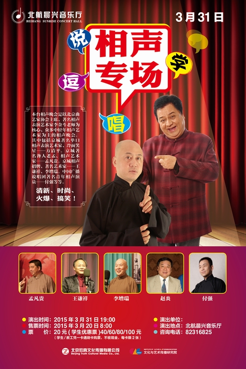 本台相声晚会是以北京曲艺家协会主席、著名相声表演艺术家李金斗老师为核心、众多中轻年相声艺术家为主的相声晚会。其中包括京城著名单口相声表演艺术家、冷面笑星——方清平。京城著名谗人老孟、相声艺术家——孟凡贵。京城相声招牌、著名艺术家——王谦祥、李增瑞。中国广播说唱团著名青年相声演员——付强等等。