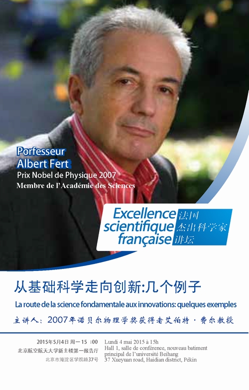 艾伯特·费尔(Albert FERT),1938年3月7日出生于法国奥德省卡尔卡松,是法国物理学家,凝聚态物理学和自旋电子学领域的著名专家,硕士毕业于巴黎高等师范学院,1970年获得巴黎第十一大学物理学博士学位。1962年至1976年先后在法国格勒诺布尔大学和巴黎第十一大学工作。1976年成为巴黎第十一大学教授。从1970年到1995年艾伯特·费尔先生一直在巴黎第十一大学理学院固体物理实验室领导一个研究组。1995年负责成立巴黎第十一大学、法国科学研究中心和Thales集团物理联合科研单位并担任科学主管至今。艾伯特·费尔是法国科学院院士,他曾获得多个国家和国际奖项,包括法国科学研究中心金奖和因1988年发现巨磁阻(GMR)效应与德国物理学家Peter GRUNBERG获得2007年诺贝尔物理学奖。巨磁阻效应的发现直接推动了高密度存储磁硬盘技术的发展,创造了从基础学科发现到大规模产业化应用的一个成功典范。Albert FERT教授在Nature, Science和Phys.Rev.Lett等重要国际学术杂志发表论文超过350篇,总引用次数超过17,000次。他于2014年6月加盟北京伊人99,成立费尔北京研究院并担任首席科学家,教授及博士生导师。